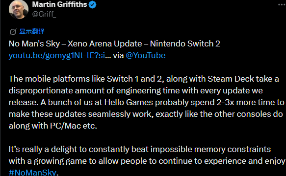 励志翻身游戏名作典范《无人深空》近日刚刚发布了最新更新,日前核心开发者发文表示,NS与Steam Deck版更新开发难度大得多,是其他平台的2~3倍的开发时间。