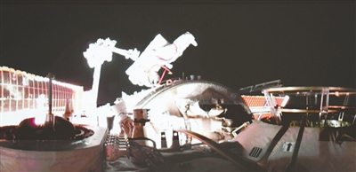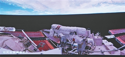 在北京航天飞行控制中心屏幕上拍摄的陈中瑞在空间站组合体舱外工作画面。新华社记者 厉彦辰 摄